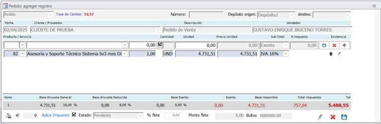 Para registrar un pedido de venta se requiere que los productos o servicios estén previamente registrados en el sistema, y al finalizar la ejecución del proceso se cuenta con un pedido de venta registrado en estado pendiente, el cual se puede consultar, imprimir o transformar en un archivo PDF, así como ser utilizado – cargado para generar una factura de venta a partir de ese pedido.